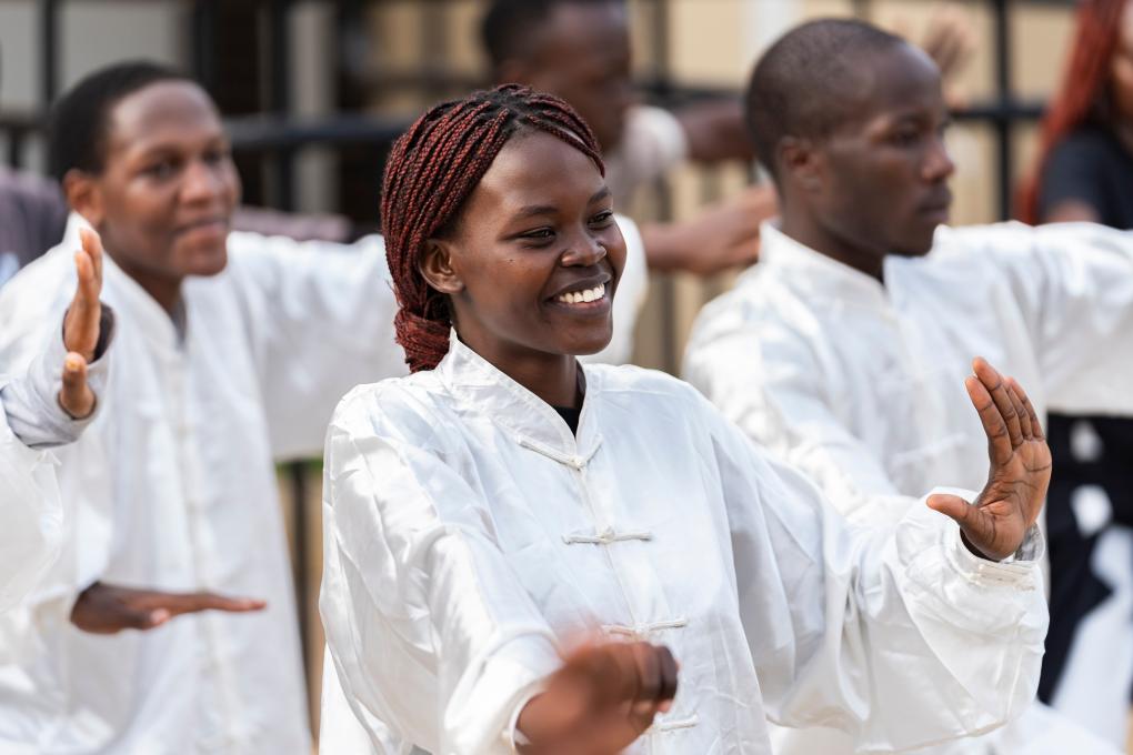 18日、ケニア・ナイロビ大学孔子学院で太極拳を練習する地元学生。(ナイロビ=新華社記者/謝剣飛)