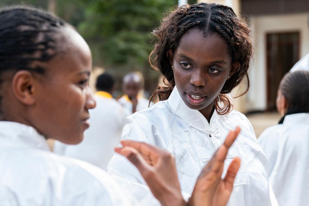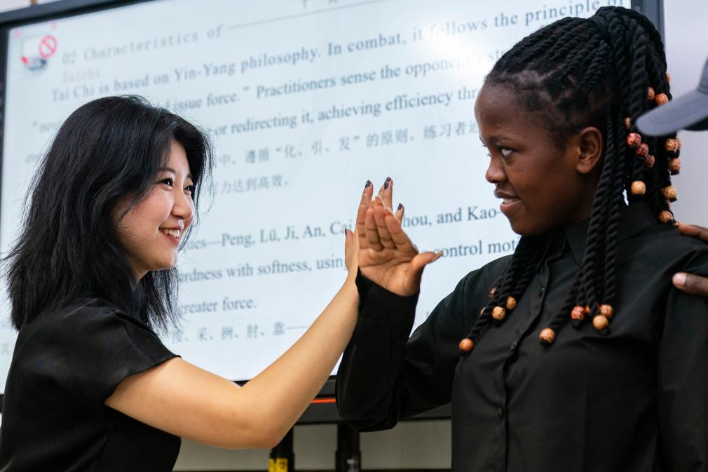 18日、ナイロビ大学孔子学院で太極拳の組手「推手」を練習する地元学生。(ナイロビ=新華社記者/謝剣飛)