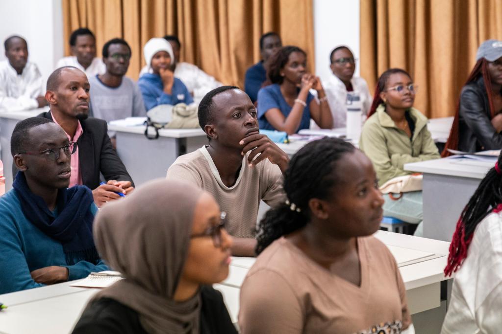 18日、ケニア・ナイロビ大学孔子学院で太極拳に関する知識を学ぶ地元学生。(ナイロビ=新華社記者/謝剣飛)