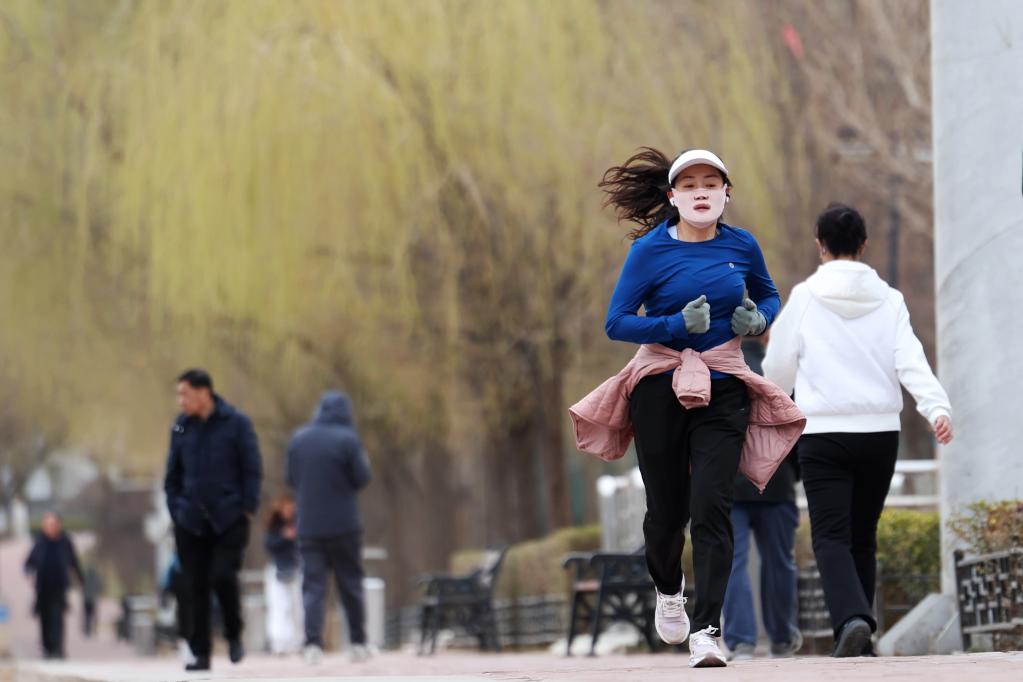 18日、蘭州市城関区を流れる黄河沿いのジョギングコースを走る市民。(蘭州=新華社記者/陳斌)