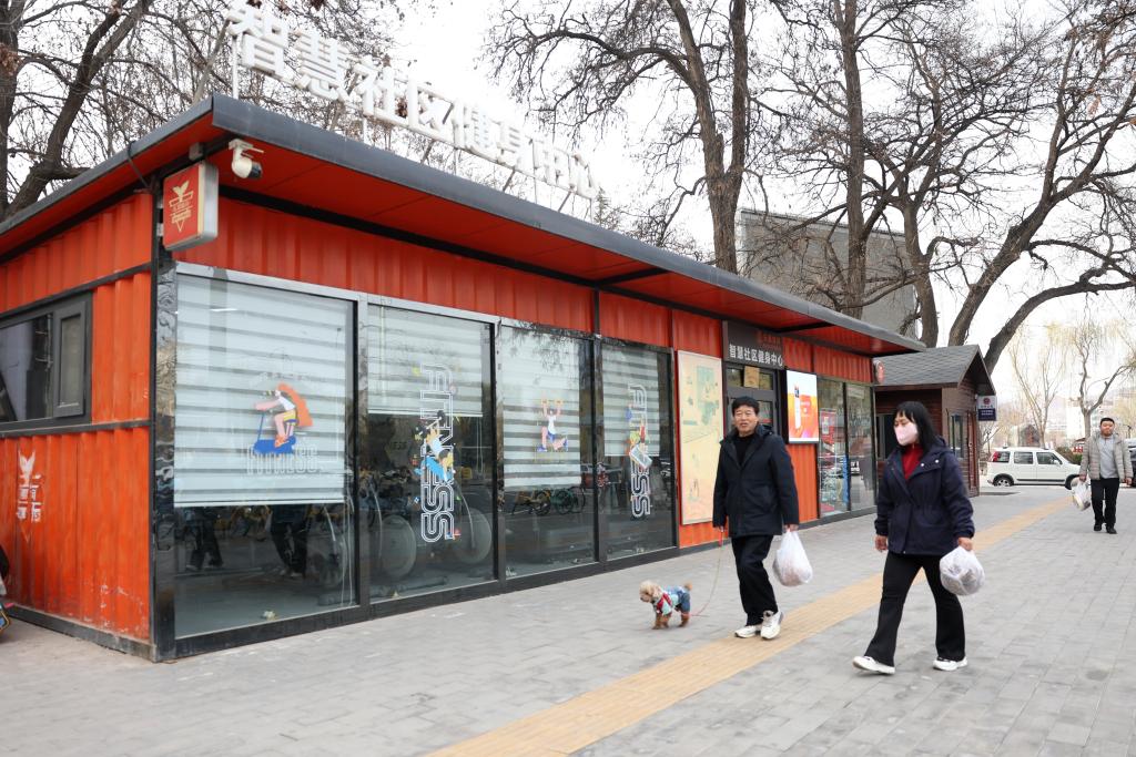 17日、蘭州市城関区のスマート社区フィットネスセンターの前を通る市民。(蘭州=新華社記者/陳斌)