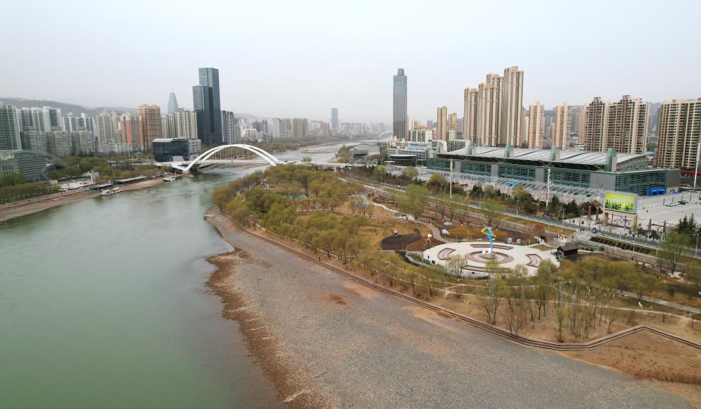 18日、蘭州市城関区を流れる黄河沿いのマラソン公園。(ドローンから、蘭州=新華社記者/陳斌)