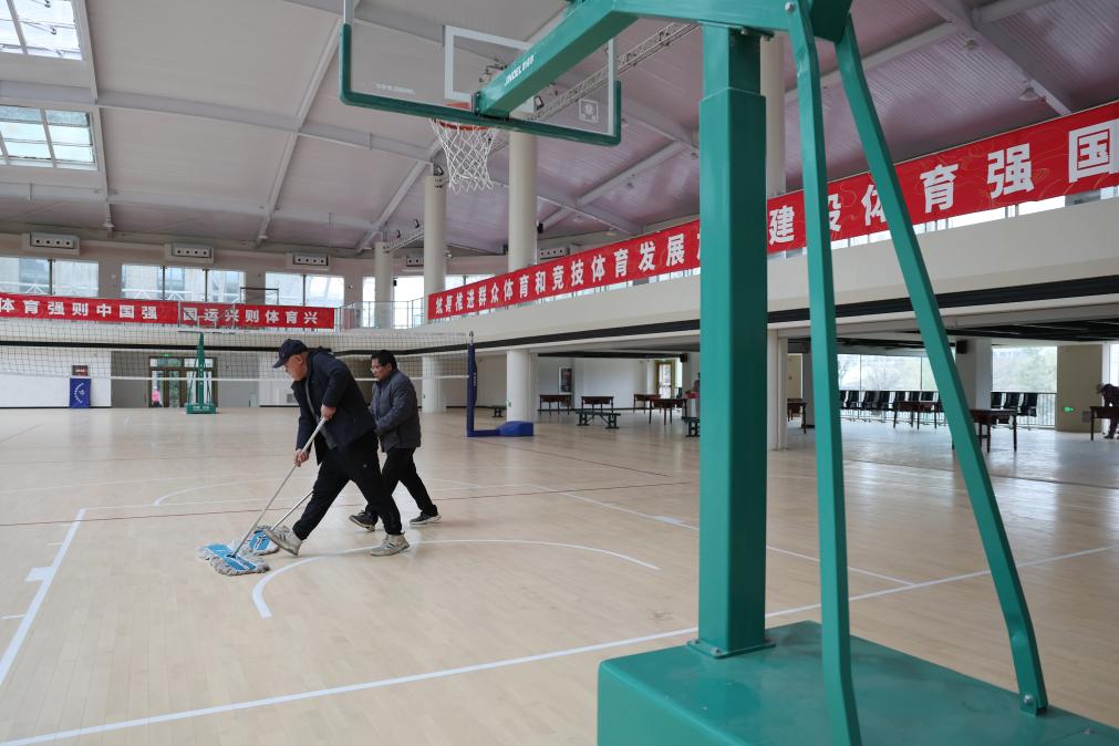 18日、改修を終え間もなく稼働予定の蘭州市の市民フィットネスセンターで、フロアをモップ掛けするスタッフ。(蘭州=新華社記者/陳斌)