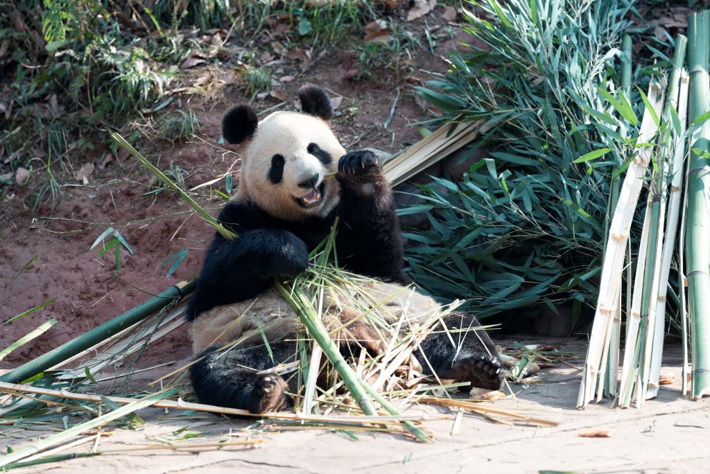 【新華社成都3月20日】中国四川省にある中国ジャイアントパンダ保護研究センター雅安碧峰峡基地で、パンダのシンシン(真真、中国名「仙女」)が竹を食べる様子が撮影された。