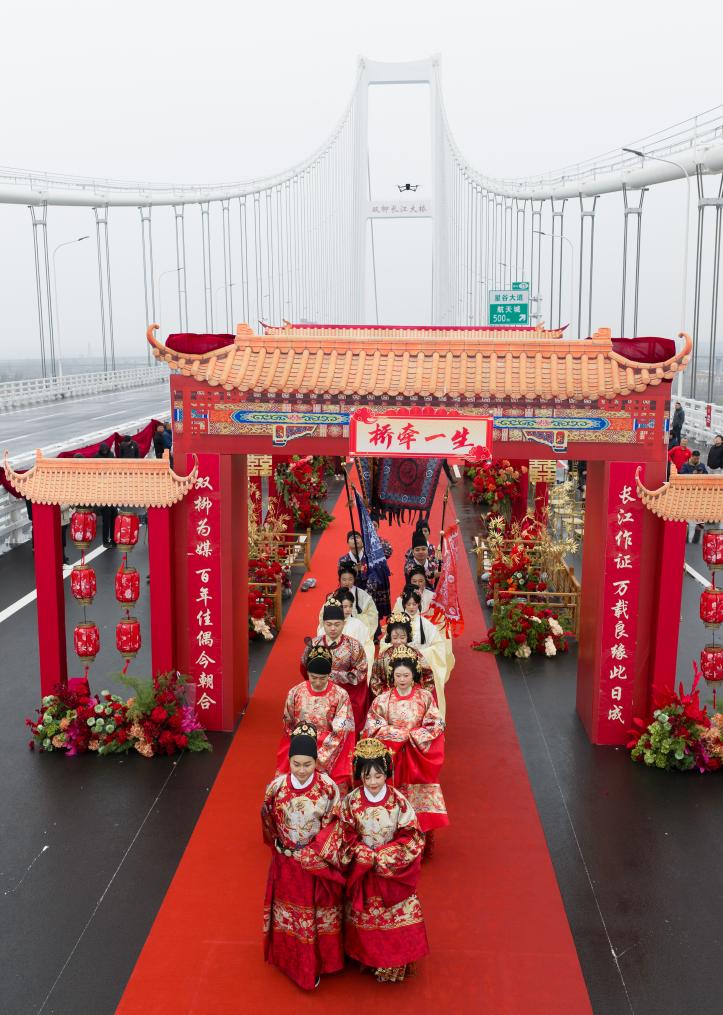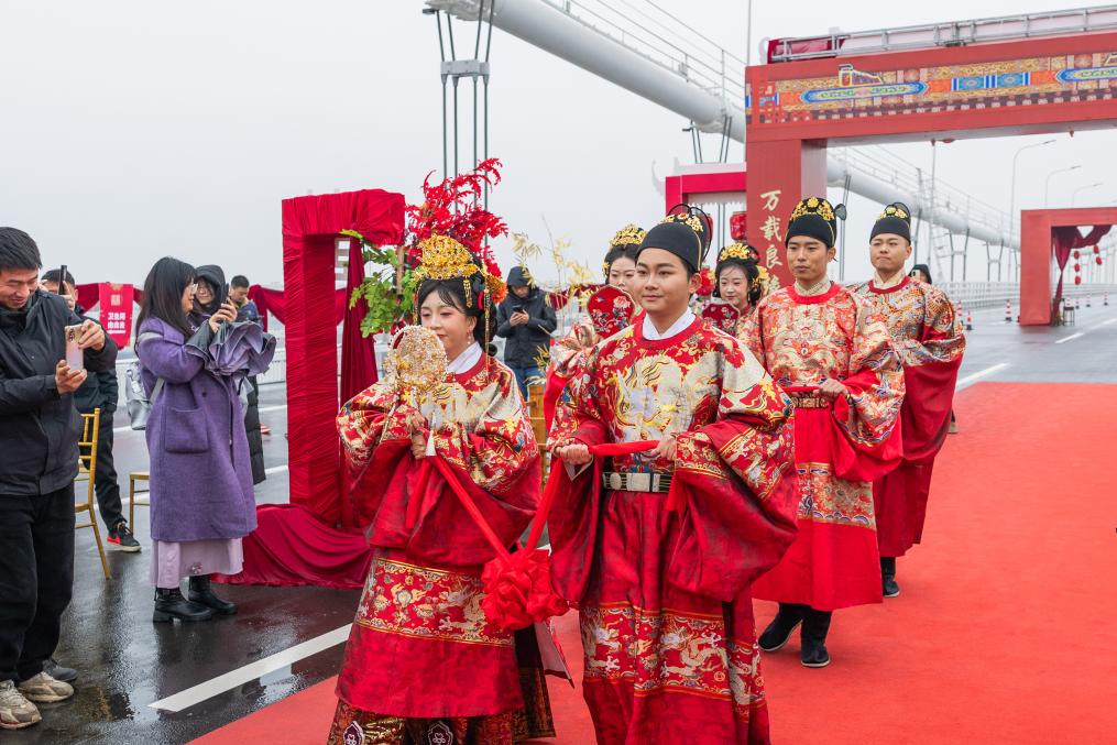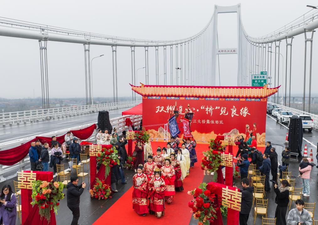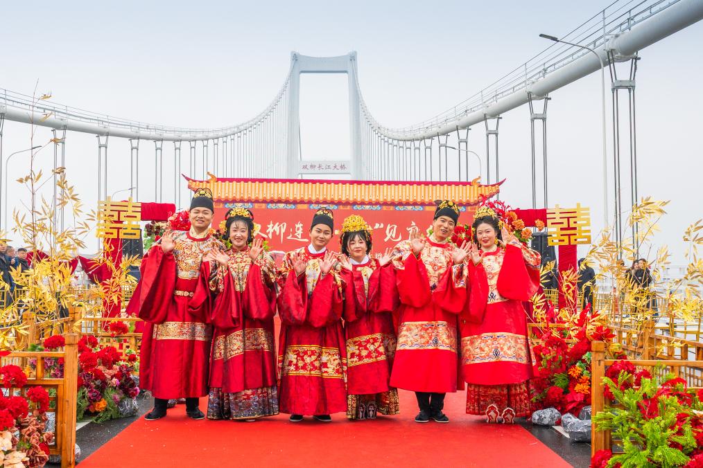 【新華社武漢3月20日】中国湖北省武漢市で建設が進む双柳長江大橋の建設現場で18日、合同結婚式が行われた。湖北交通投資集団などの同大橋建築に関連する企業所属の新郎新婦3組が、中国の伝統的な婚礼衣装を身にまとい、親族や友人、同僚らの祝福に包まれながら、新たな門出を迎えた。