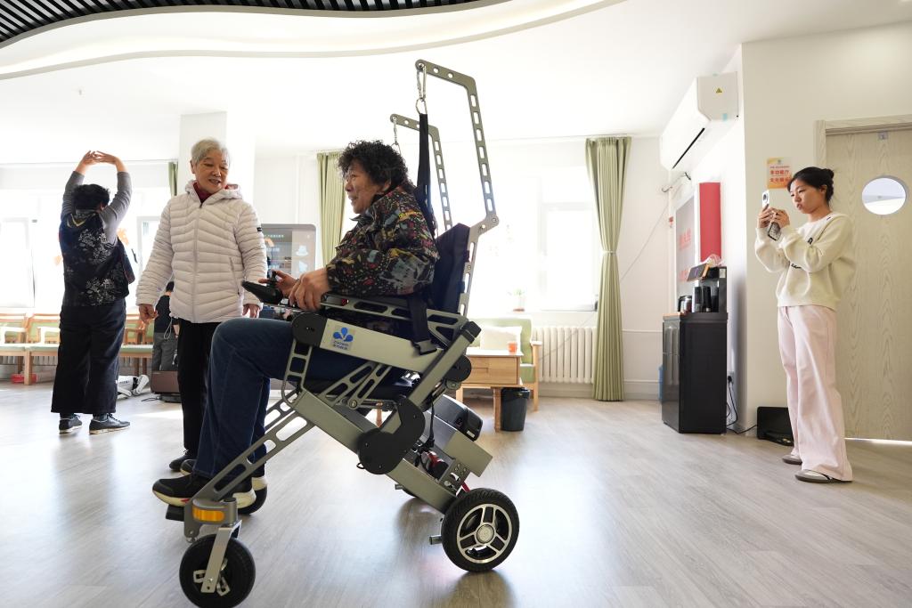 18日、スマート康養ロボット高齢者介護ステーションでスマート理学療法ロボットを体験する社区の住民。(北京=新華社記者/鞠煥宗)