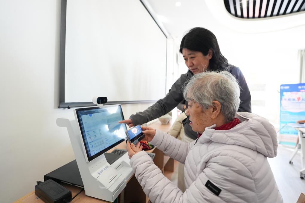 18日、スマート康養ロボット高齢者介護ステーションでスマートヘルスケア機器を体験する社区の住民(手前)。(北京=新華社記者/鞠煥宗)