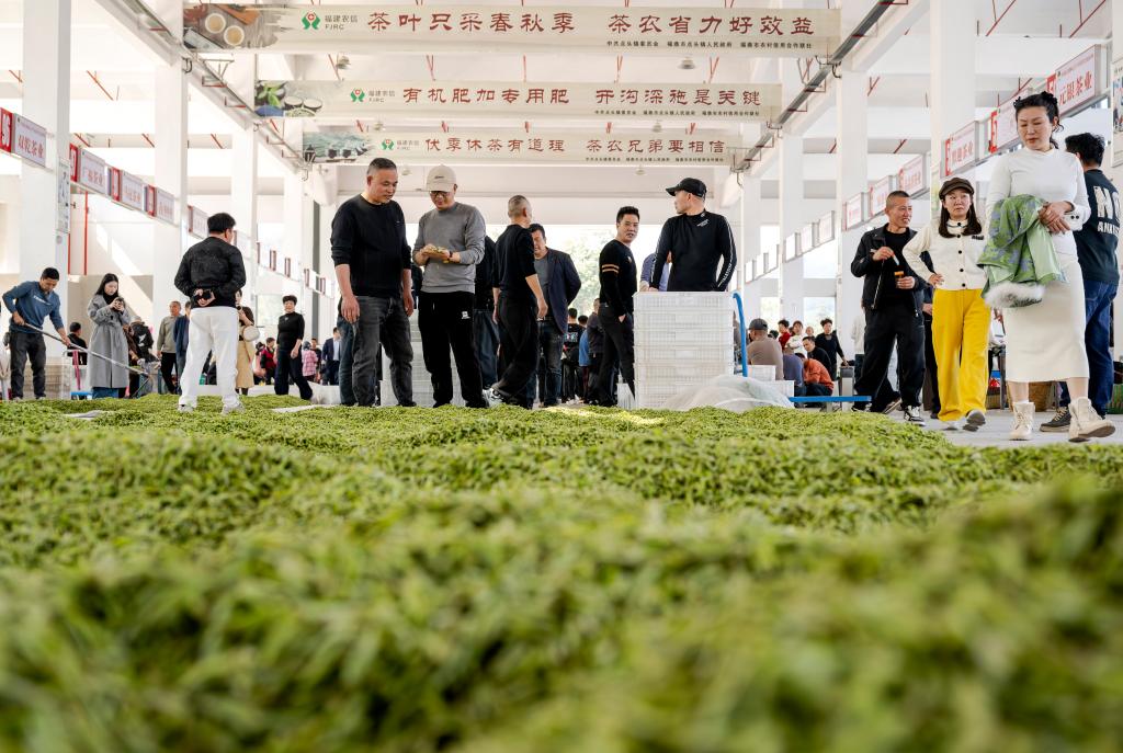 18日、福建省福鼎市点頭鎮にある白茶の茶葉交易市場で、摘み取ったばかりの茶葉を販売する茶農家。(福州=新華社記者/魏培全)
