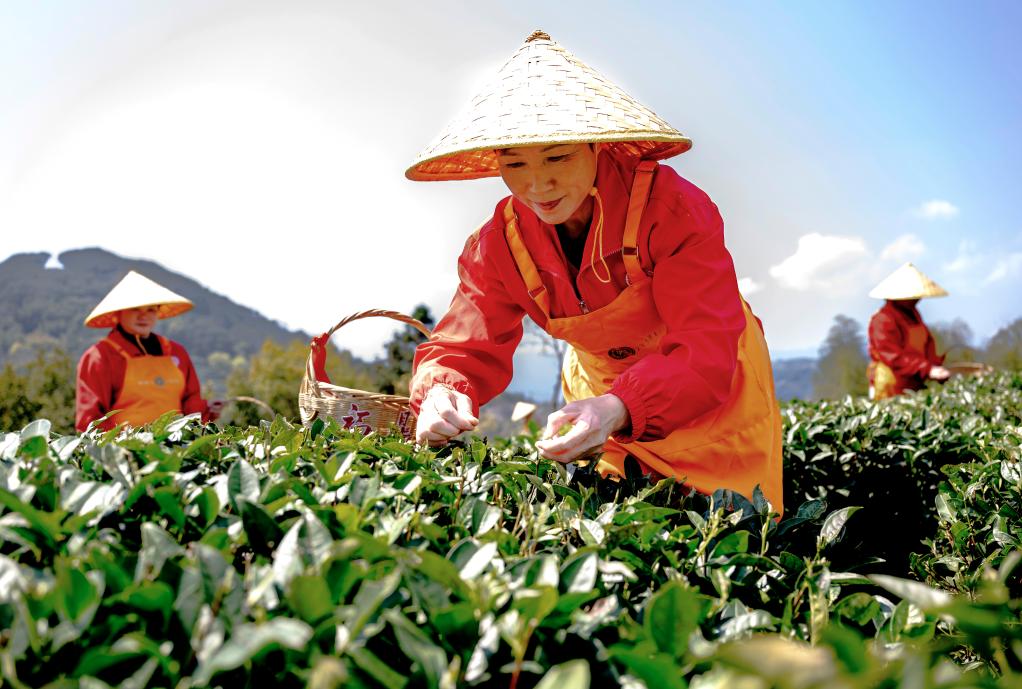 18日、福建省の製茶企業、六妙白茶が運営する福鼎市国家現代農業(白茶)産業園で茶葉を摘む従業員。(福州=新華社記者/魏培全)