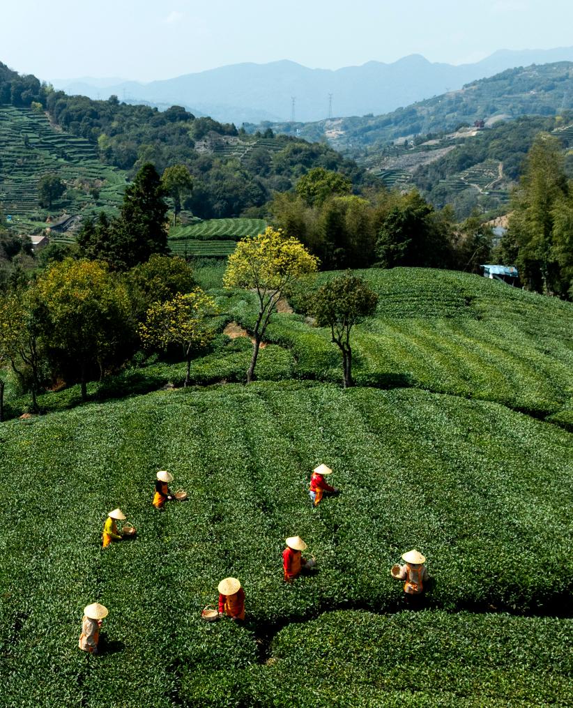 18日、福建省の製茶企業、六妙白茶が運営する福鼎市国家現代農業(白茶)産業園で茶葉を摘む従業員。(ドローンから、福州=新華社記者/魏培全)