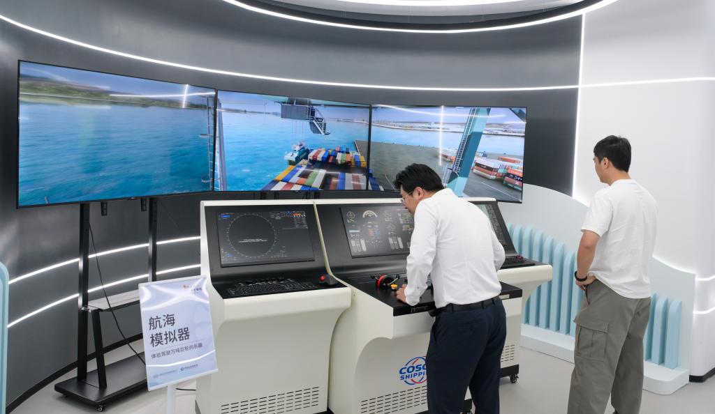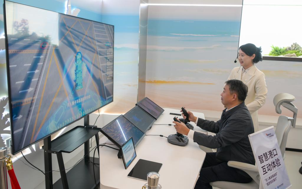 19日、「一帯一路」がテーマのデジタル展でスマート港湾のインタラクティブ体験をする来場者。(ボアオ=新華社記者/楊冠宇)