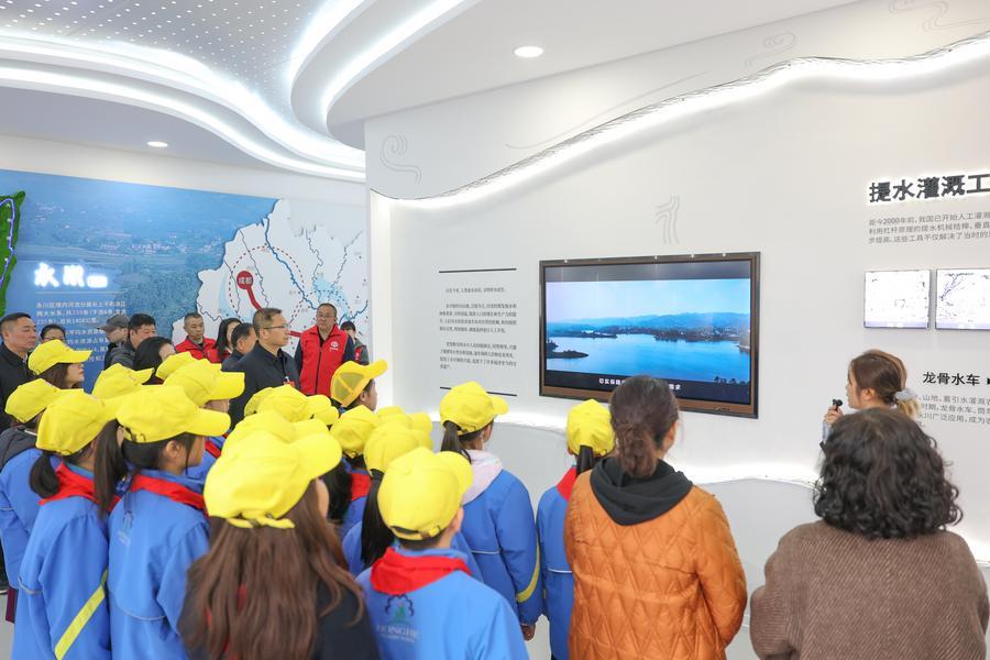 20日、重慶市永川区の臨江河水文化展示館で開かれた科学体験イベントで、揚水かんがいの紹介を見る紅河小学校の児童ら。(重慶=新華社記者/黄偉)
