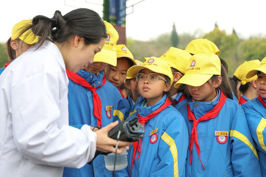 20日、重慶市永川区の神女湖畔で開かれた科学体験イベントで、紅河小学校の児童に水質検査について紹介するスタッフ(左端)。(重慶=新華社記者/黄偉)
