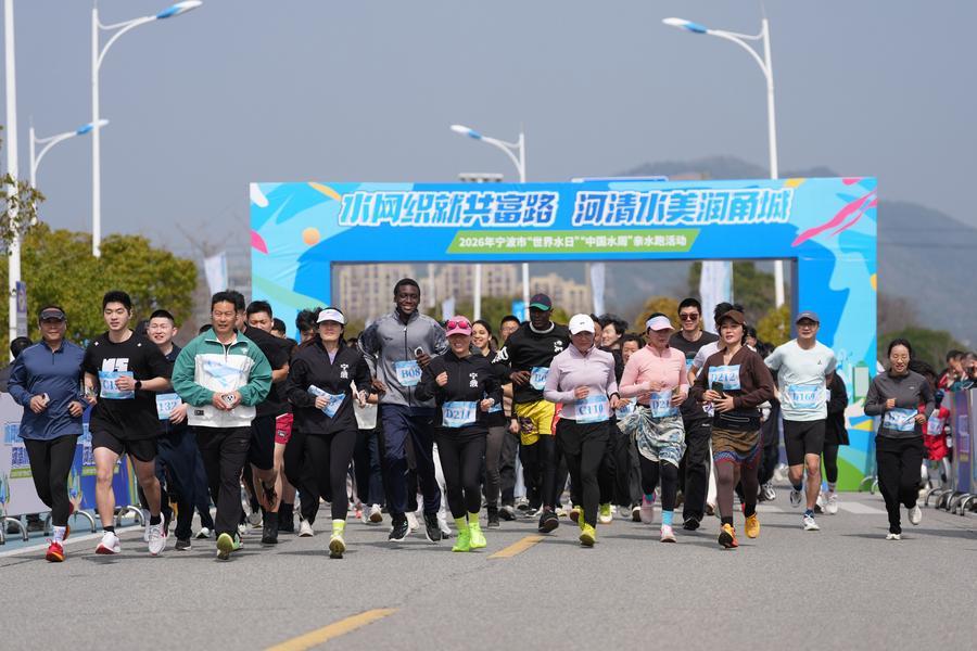 20日、浙江省寧波市の「世界水の日」「中国水週間」親水マラソンに参加したランナーたち。(杭州=新華社記者/黄宗治)