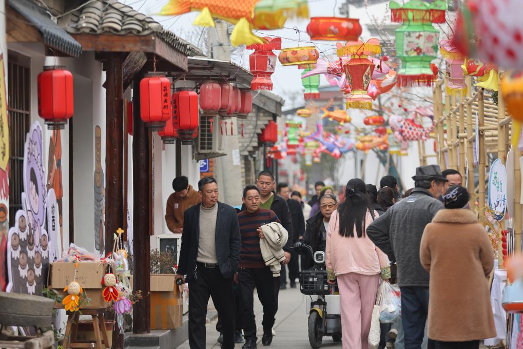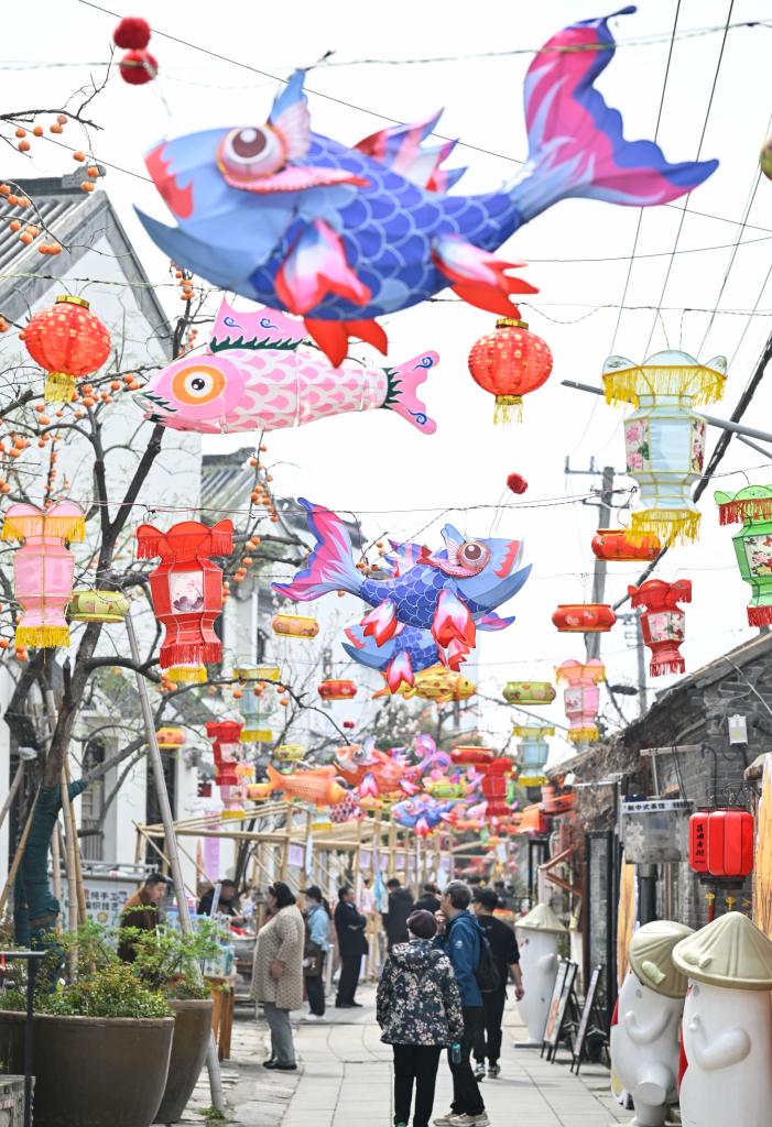 21日、蔣壩鎮の歴史的な街並みを再生した蔣壩老街を散策する観光客。(淮安=新華社配信/万震)