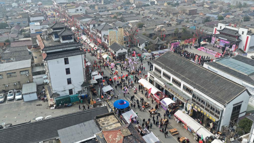 21日、蔣壩鎮で開かれた「タニシ美食観光フェア」のマーケットを訪れた観光客。(ドローンから、淮安=新華社配信/殷潮)