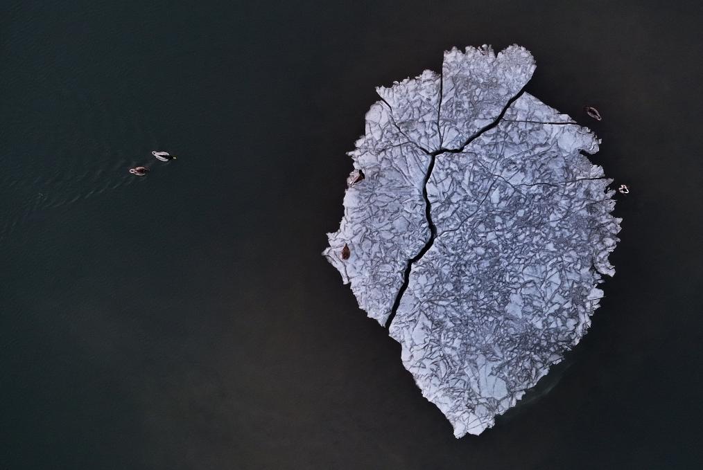 22日、松花江で羽を休める渡り鳥。(ドローンから、ハルビン=新華社配信/張樹)