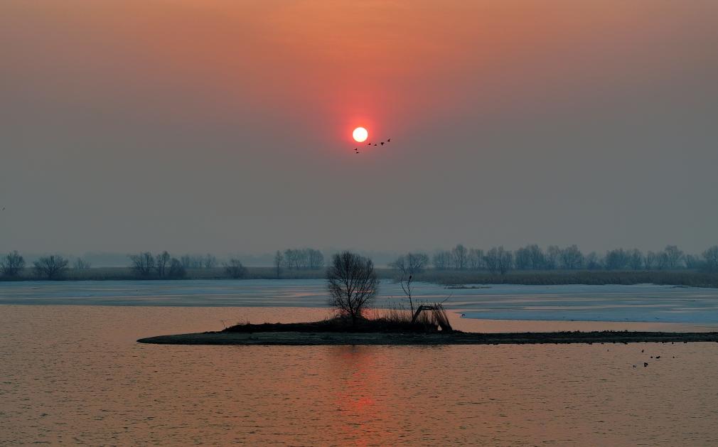 22日、松花江の上空を朝日を受けて飛ぶ渡り鳥。(ハルビン=新華社配信/張樹)