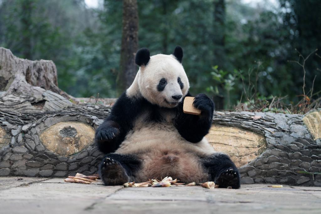 窩窩頭の匂いをかぐシャンシャン。(1月20日撮影、雅安=新華社配信/Panda365提供)