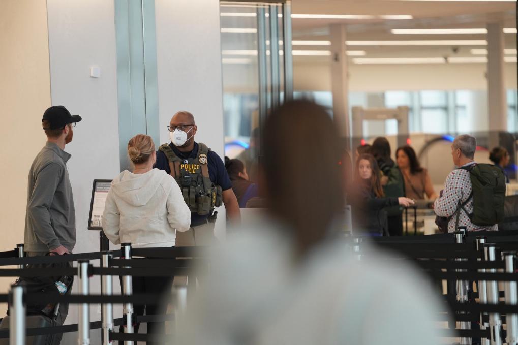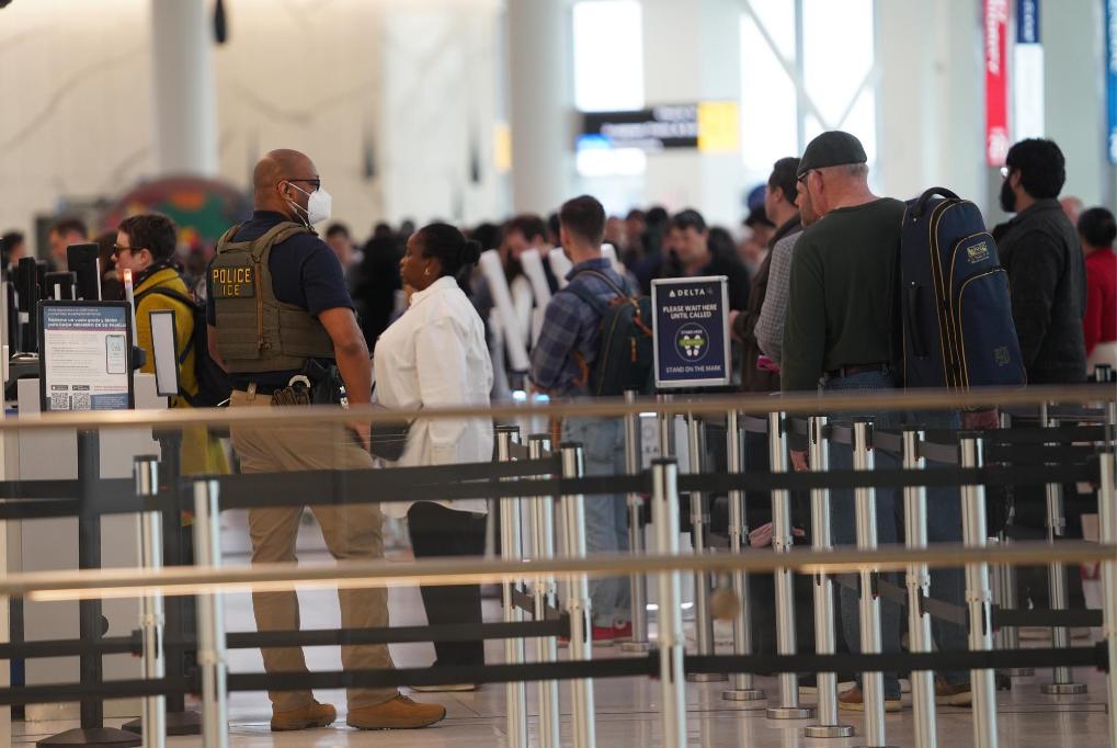 23日、米ニューヨーク・ラガーディア空港の出発保安検査場で勤務するICE捜査官。(ニューヨーク=新華社記者/張鳳国)