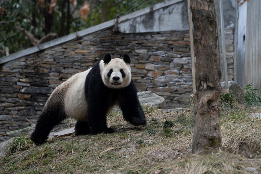 【新華社成都3月25日】中国四川省のジャイアントパンダ保護研究センター臥竜神樹坪基地で、雄のパンダ、リーリー(力力、中国名「比力」)が敷地内を歩く様子が撮影された。