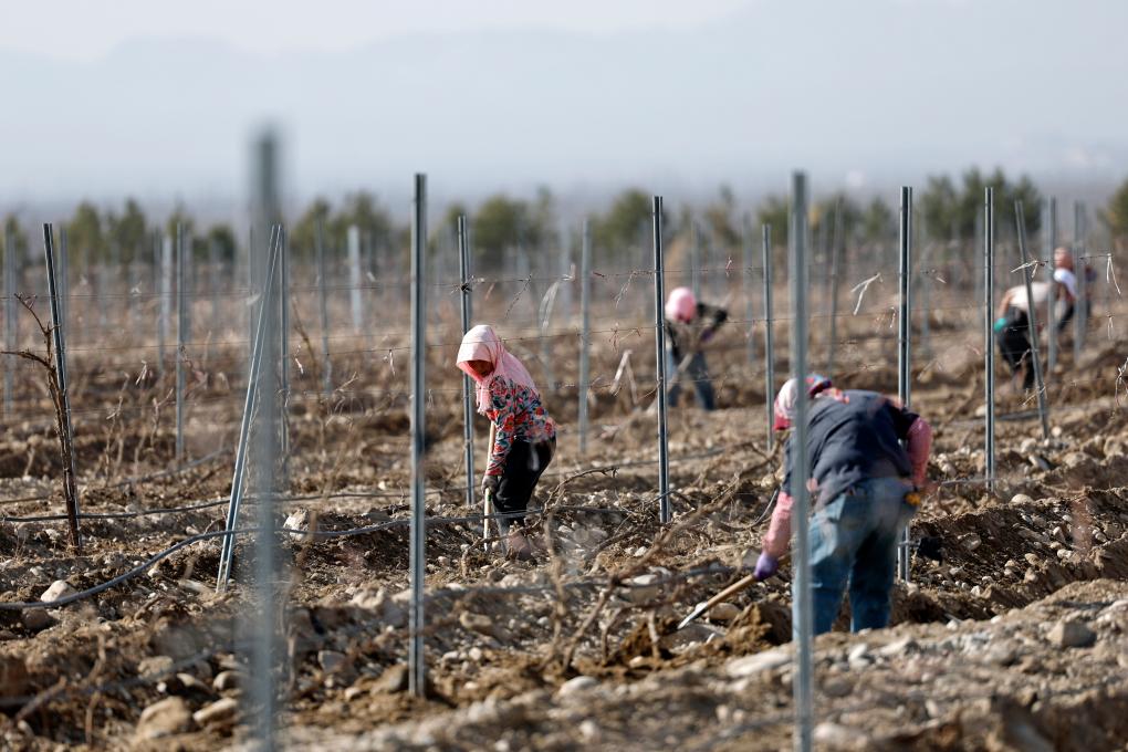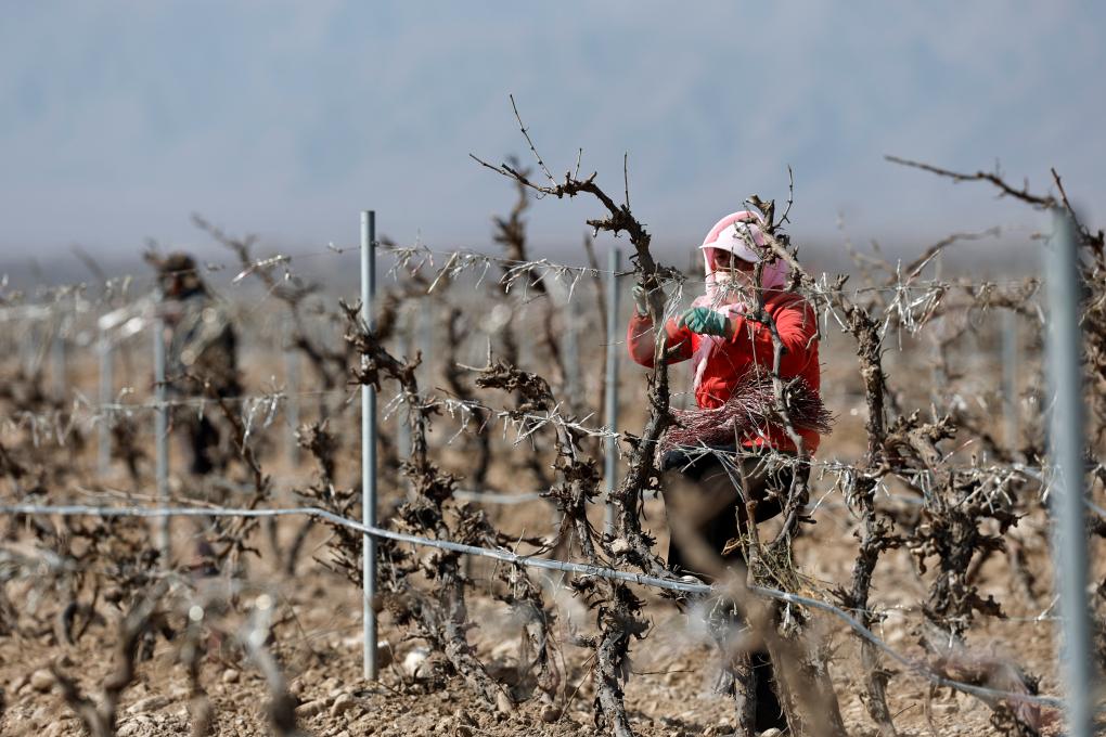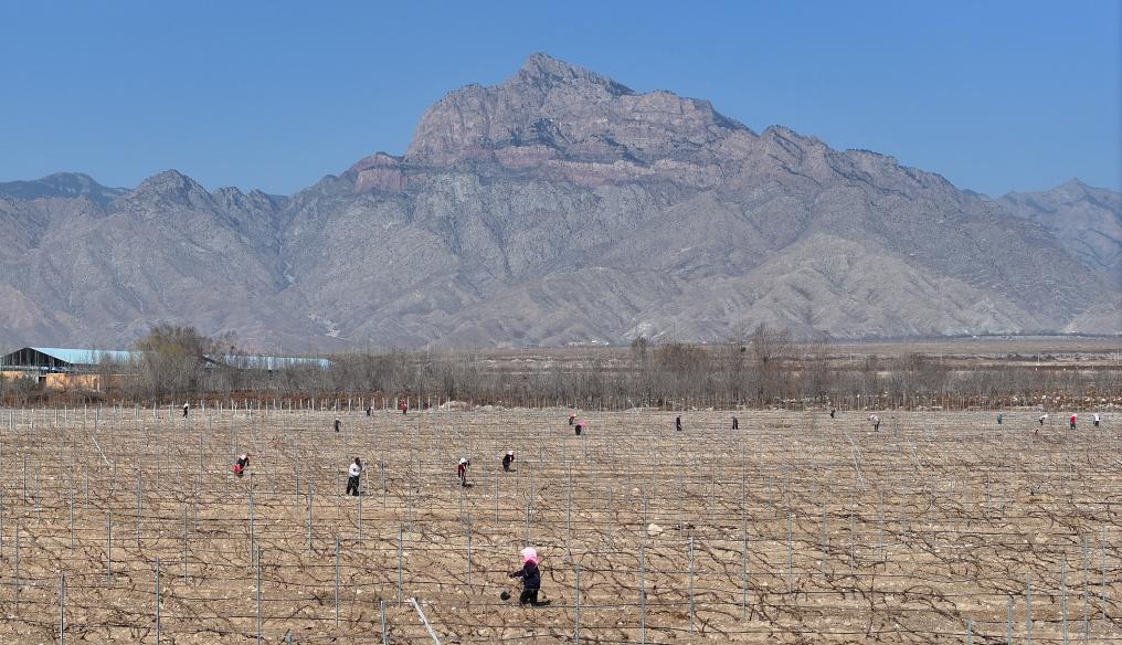 【新華社銀川3月25日】中国寧夏回族自治区賀蘭山東麓の高品質ワイン用ブドウ産地では、気温の上昇とともに数十万ムー(1ムー=約667平方メートル)のブドウの木が「冬眠」から目覚め、冬の間土に埋めていたつるを掘り起こし、ブドウ棚へ誘引する作業が始まった。