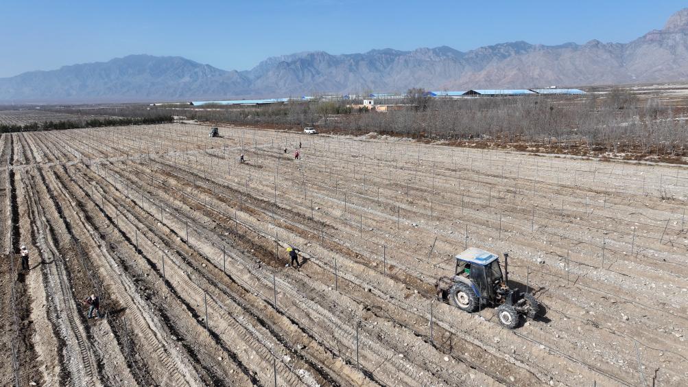 23日、賀蘭山東麓のワイン用ブドウ栽培拠点で、ブドウのつるを伸ばし、土寄せをする農家の人。(ドローンから、銀川=新華社記者/王鵬)