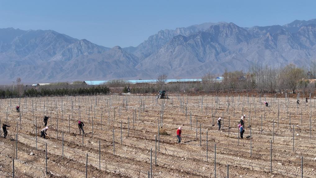 23日、賀蘭山東麓のワイン用ブドウ栽培拠点で、ブドウのつるを伸ばし、土寄せをする農家の人。(銀川=新華社記者/王鵬)
