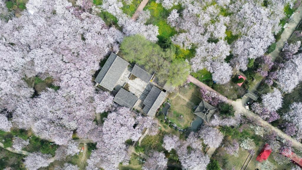 24日、河南省鄢陵(えんりょう)県の唐韻桜花園で満開となった桜。(ドローンから、鄢陵=新華社配信/牛書培)