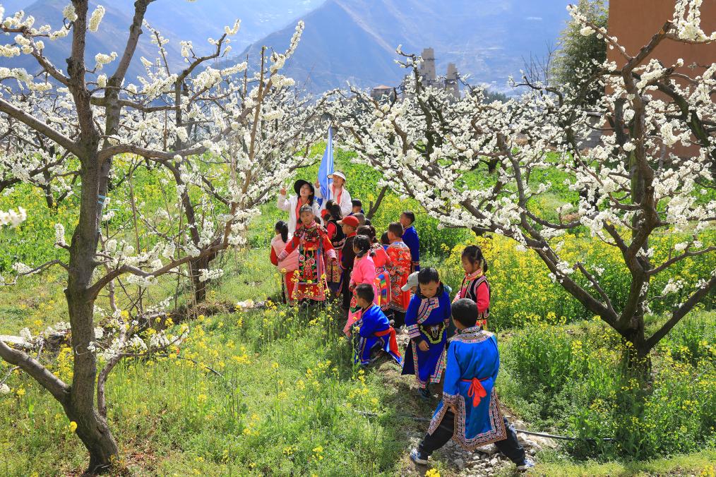 24日、四川省アバ・チベット族チャン族自治州茂県坪頭村で、花を楽しむ藍天幼稚園の園児ら。(アバ=新華社配信/何清海)