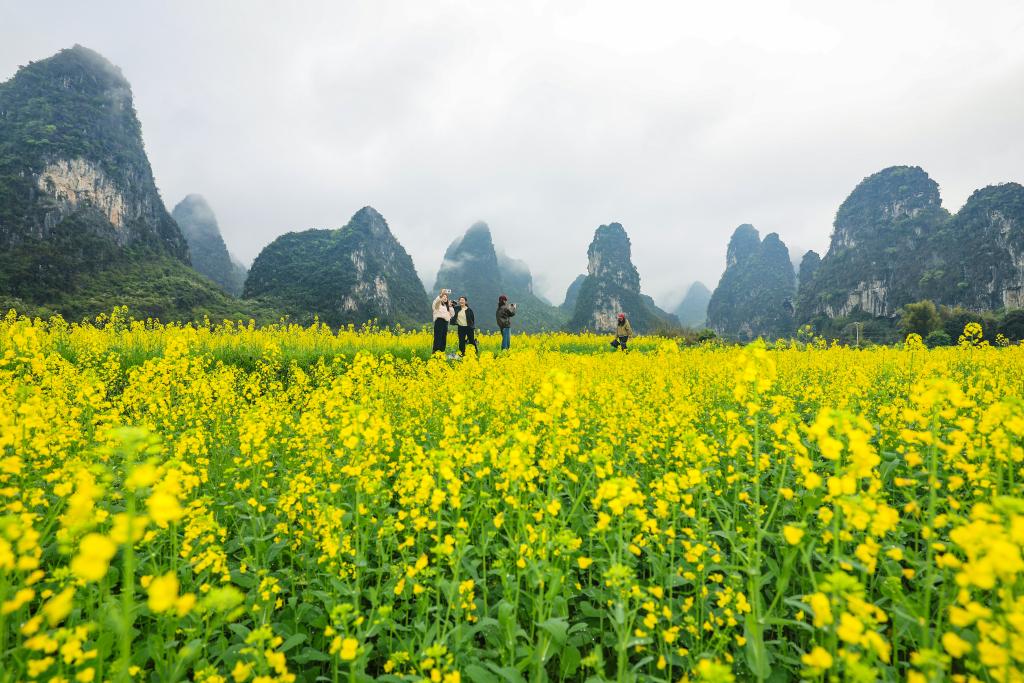 24日、広西チワン族自治区桂林市雁山区の菜の花畑を散策する人たち。(桂林=新華社配信/劉教清)