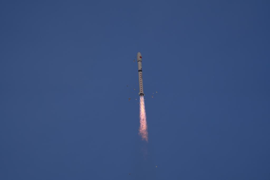26日、「四維高景2号」5、6号機を搭載し、上昇する運搬ロケット「長征2号D」。(太原=新華社配信/王亜鵬)