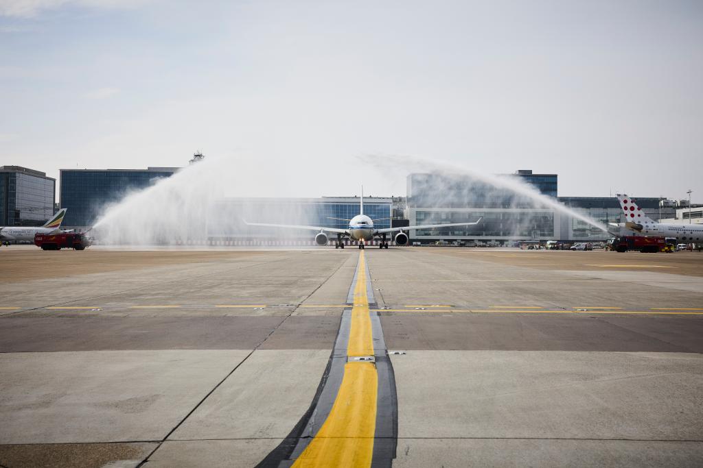 24日、ブリュッセル空港で、放水アーチに見送られて出発する中国国際航空のブリュッセル-北京線第1便。(ブリュッセル=新華社配信)