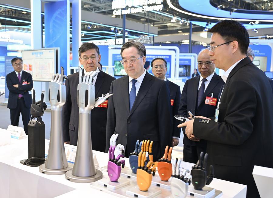 25日、中関村展示センターの常設展示を視察し、科学技術関係者と交流する丁薛祥氏。(北京=新華社記者/高潔)