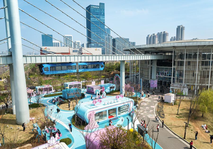 21日、走行中の懸垂式モノレールを撮影する観光客。(武漢=新華社記者/肖芸九)