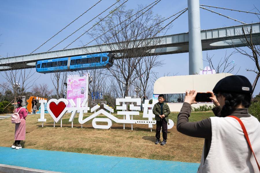 23日、懸垂式モノレールを体験する観光客。(武漢=新華社記者/肖芸九)