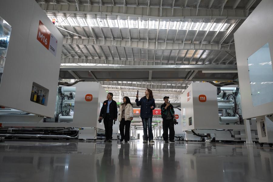 21日、小米集団(シャオミ)傘下のスマート家電工場を見学する来場者。(武漢=新華社記者/肖芸九)