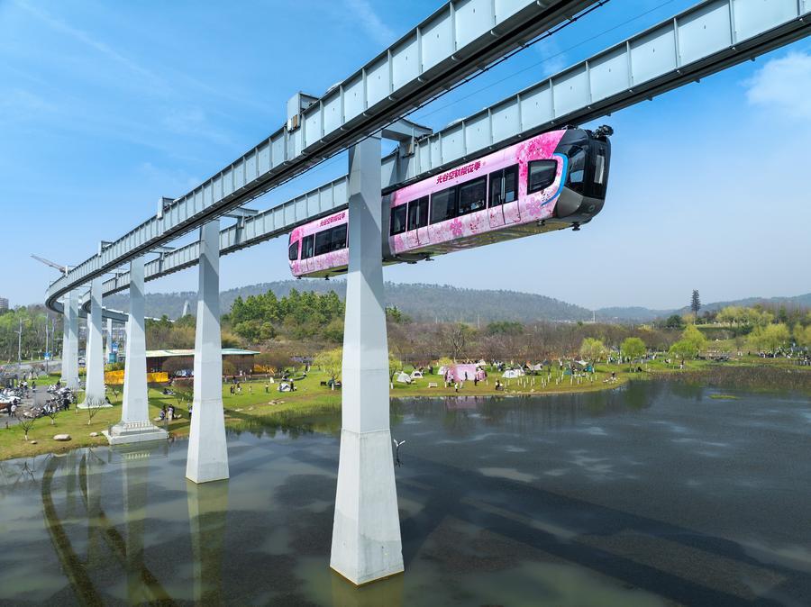 21日、走行中の懸垂式モノレール。(武漢=新華社記者/肖芸九)