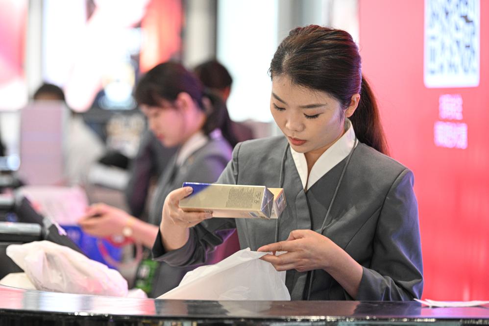 27日、海南省博鰲(ボアオ)免税店で商品を包むスタッフ。(海口=新華社記者/蒲暁旭)