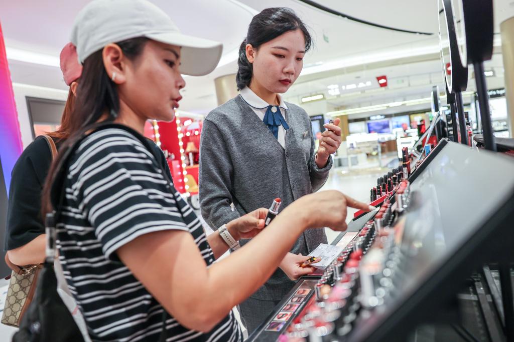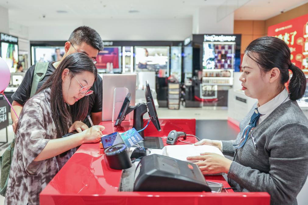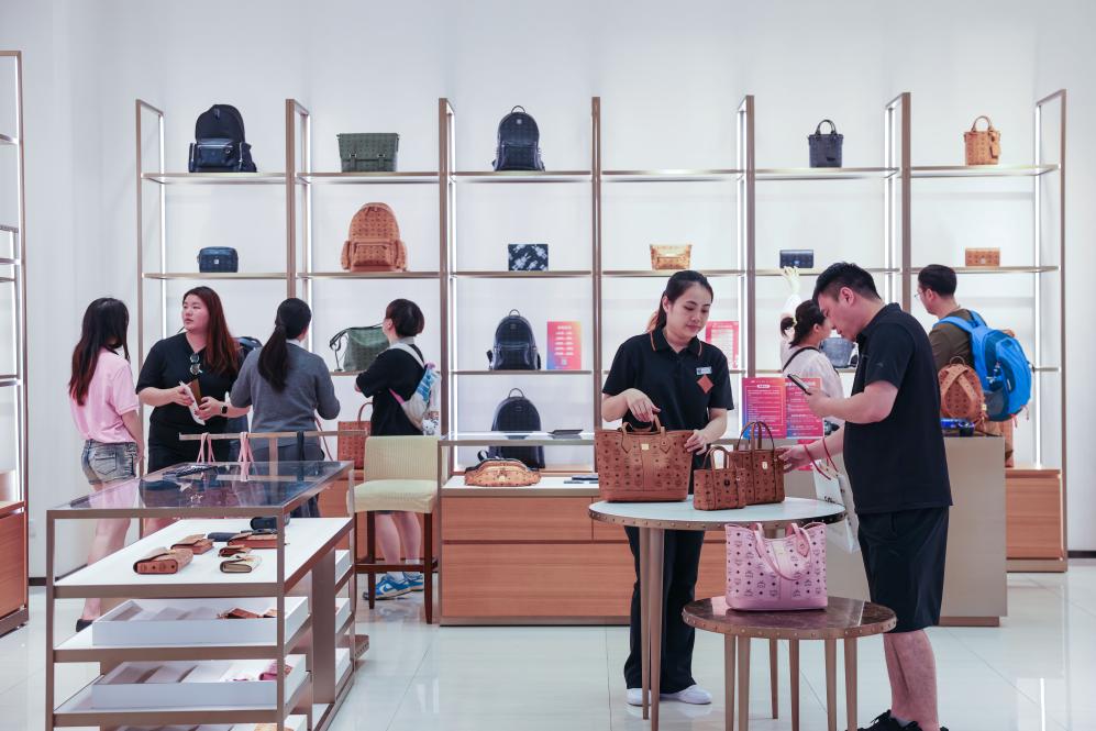 25日、海南省海口市の日月広場免税店で買い物をする客。(海口=新華社記者/張麗蕓)
