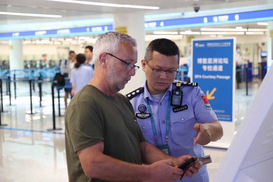 27日、海口市の美蘭出入境検査所で、旅客に入境カードの記入方法を説明する警察官。(海口=新華社配信/王羽)
