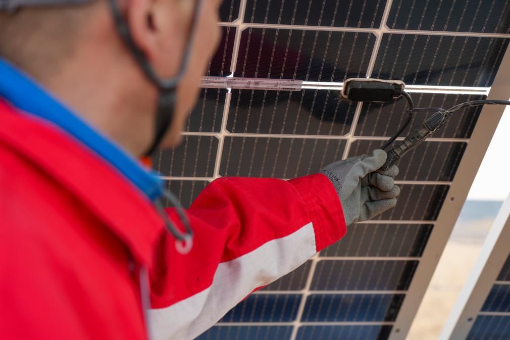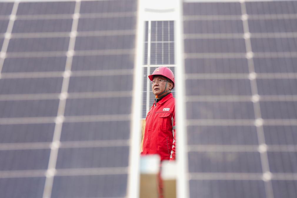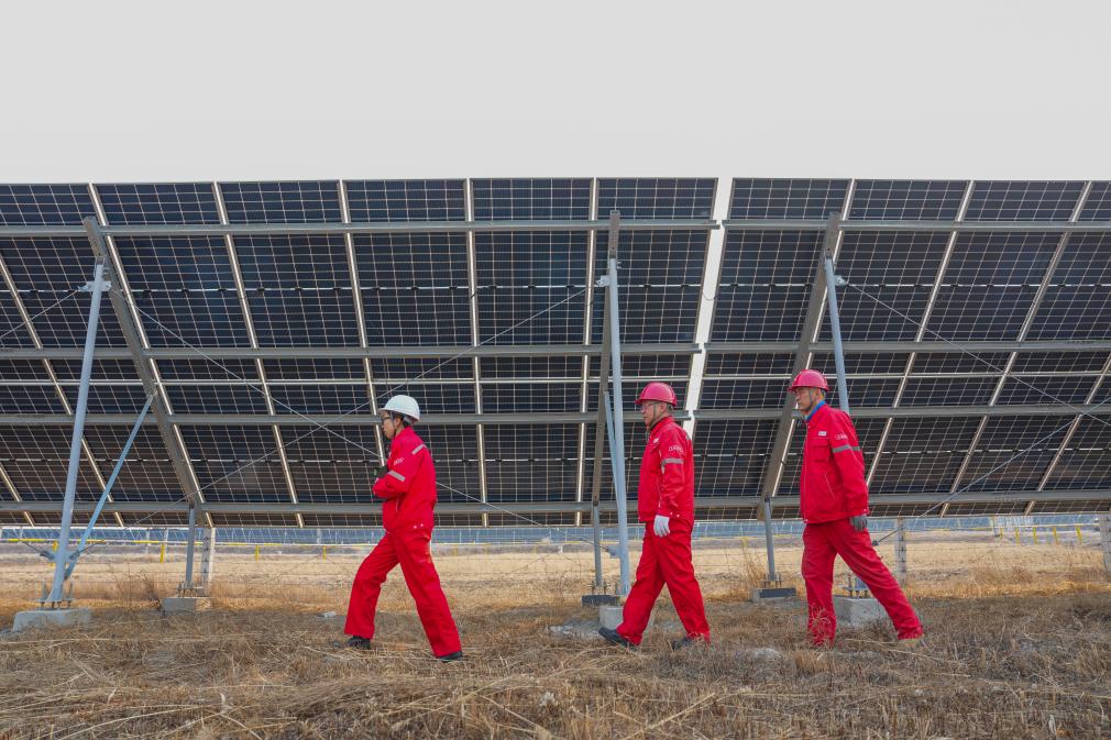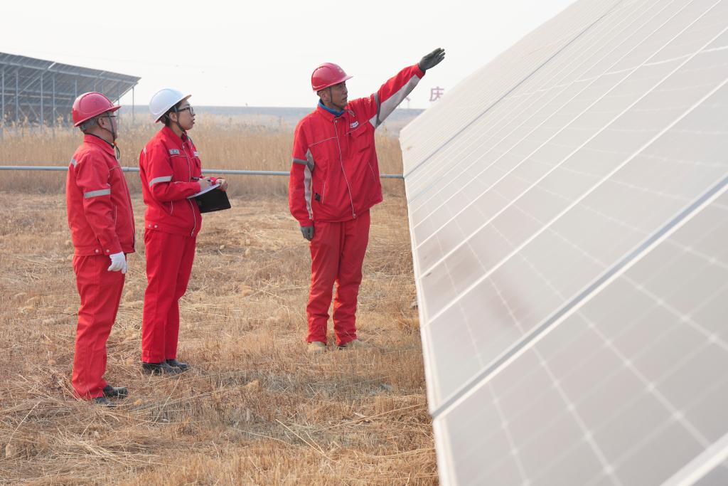 25日、大慶油田の油田区の一つ、喇嘛甸(らまでん)油田の低炭素モデル区で太陽光発電設備を巡回点検する技術者。(大慶=新華社記者/王松)