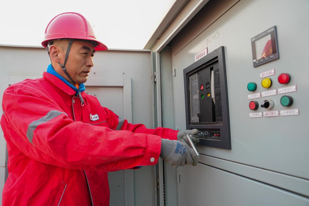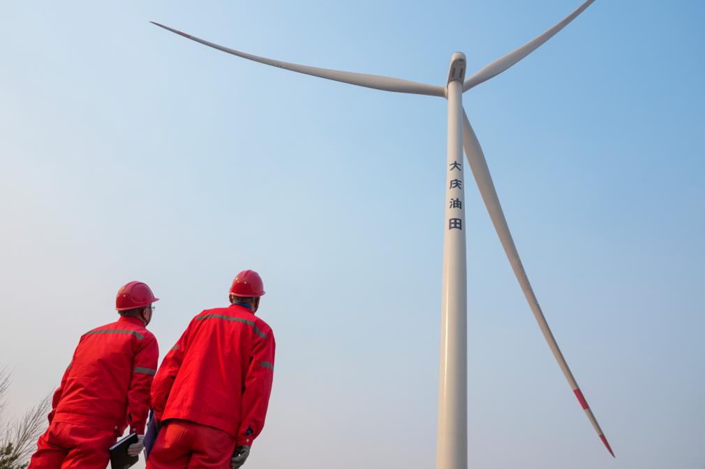 25日、大慶油田の油田区の一つ、喇嘛甸(らまでん)油田の低炭素モデル区で風力発電設備の稼働状況を確認する技術者。(大慶=新華社記者/王松)