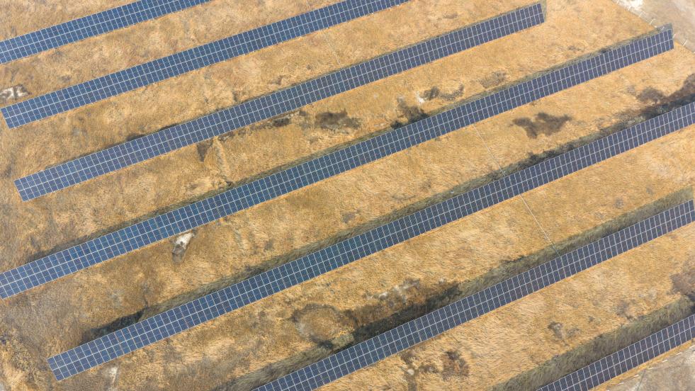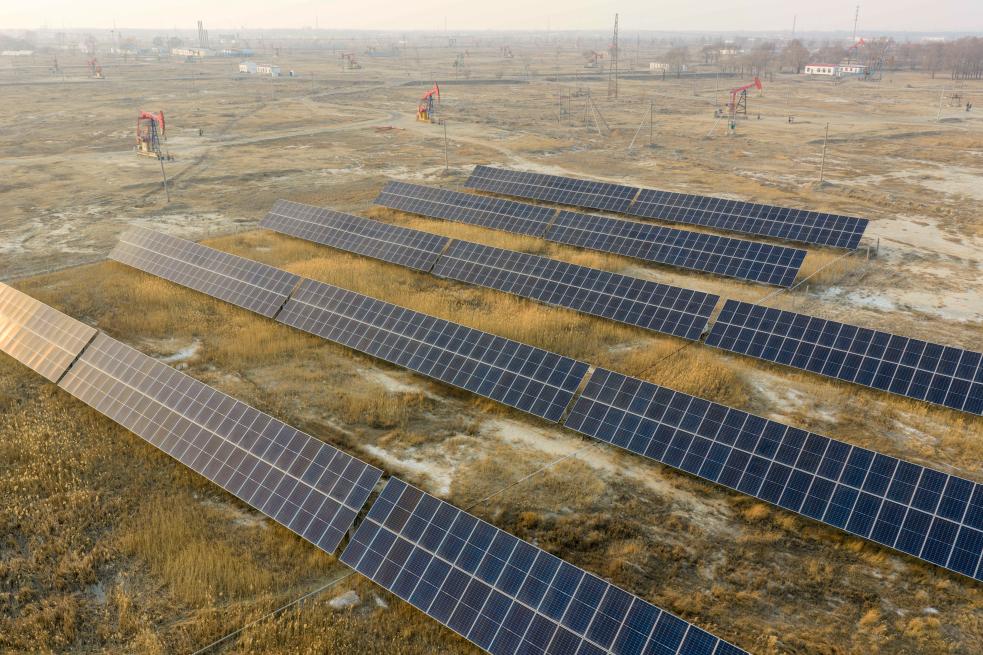 25日、大慶油田の油田区の一つ、喇嘛甸(らまでん)油田の低炭素モデル区に設置された太陽光パネル。同モデル区はCNPC初の100万トン級油田低炭素モデル区。(ドローンから、大慶=新華社記者/王松)