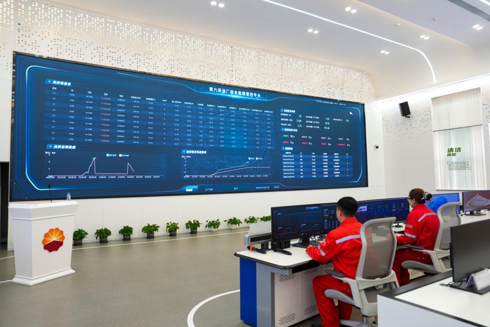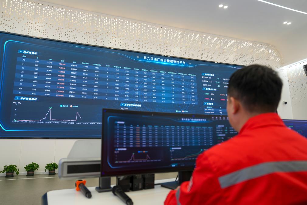 25日、大慶油田の油田区の一つ、喇嘛甸(らまでん)油田のスマート指揮センターで新エネルギー設備の稼働データをモニタリングする作業員。(大慶=新華社記者/王松)