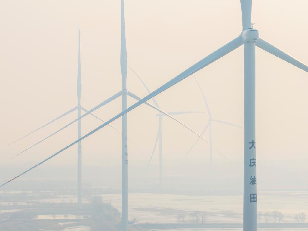 25日、大慶油田の油田区の一つ、喇嘛甸(らまでん)油田の低炭素モデル区に設置された風力発電設備。同モデル区はCNPC初の100万トン級油田低炭素モデル区。(ドローンから、大慶=新華社記者/王松)