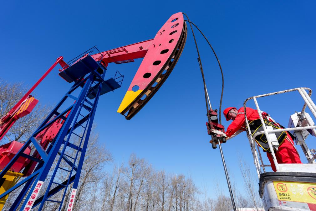 ビームポンプの保守点検を行う大慶油田の作業員。(3月6日撮影、大慶=新華社記者/王松)