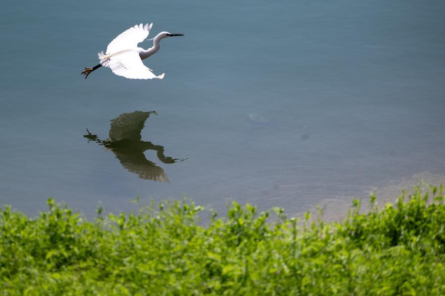27日、葛洲ダム下流付近の水面を飛ぶコサギ。(宜昌=新華社記者/肖芸九)