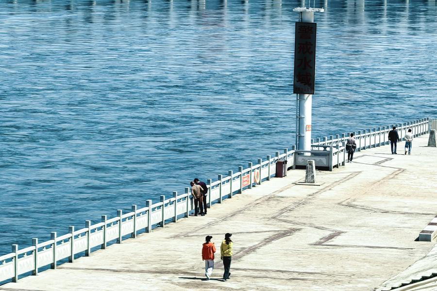 27日、葛洲ダム下流の川辺を散歩する人々。(宜昌=新華社記者/肖芸九)