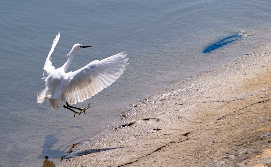 27日、葛洲ダム下流付近の水域で餌を取るコサギ。(宜昌=新華社記者/肖芸九)